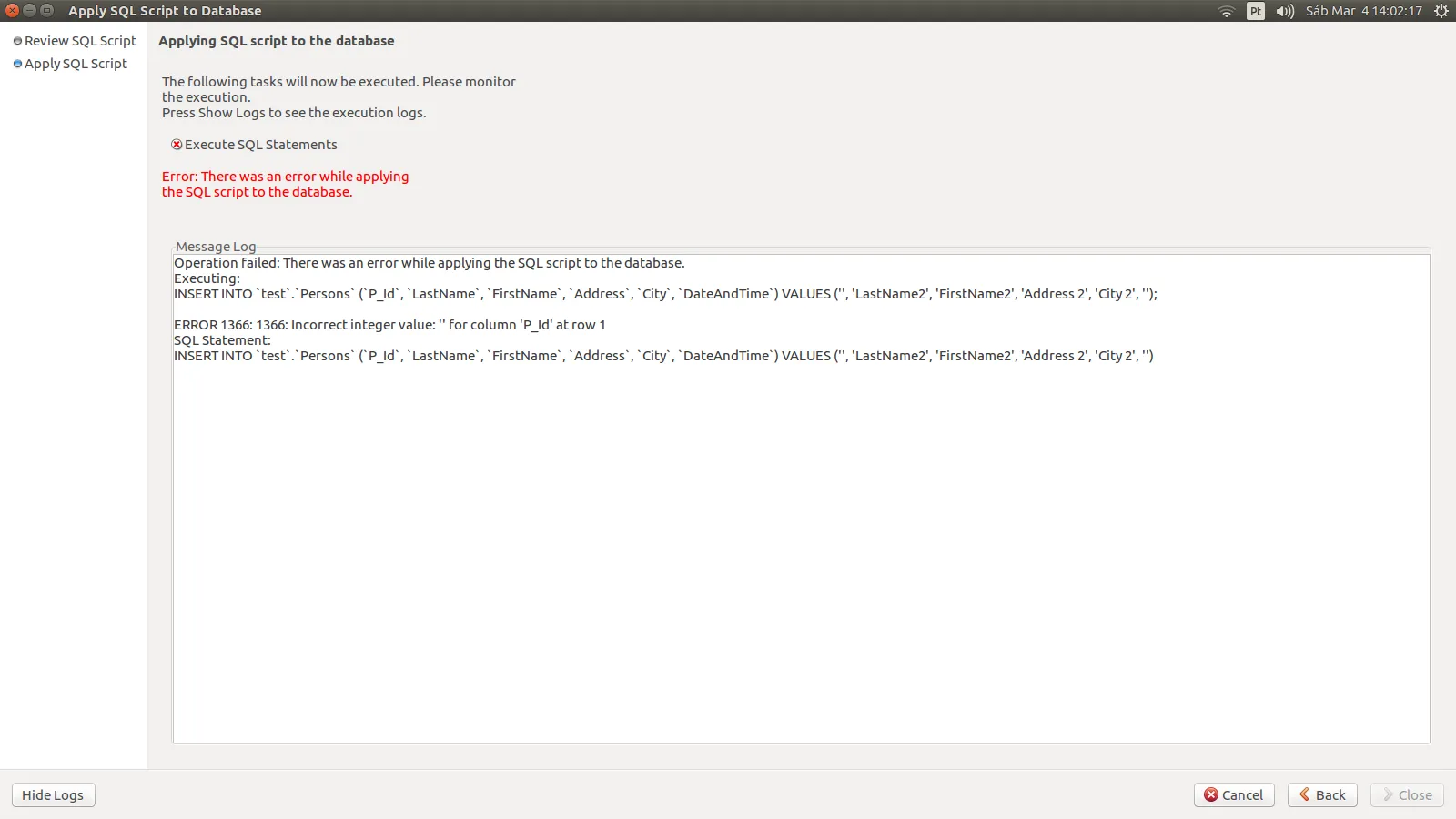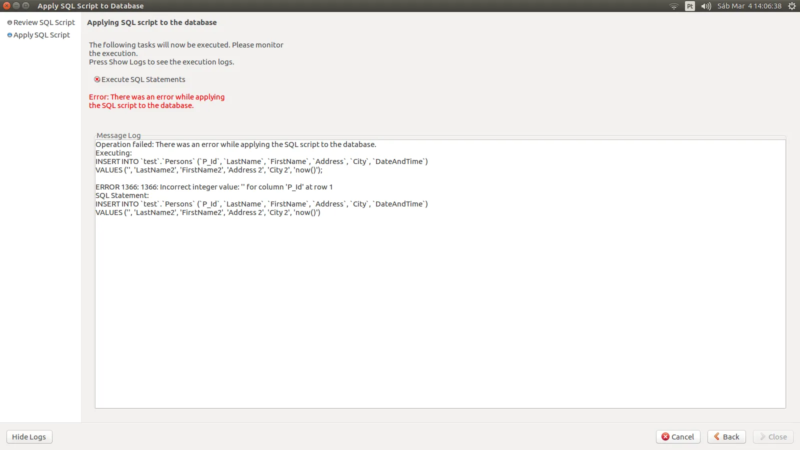Eu estava utilizando o HeidSql naquele momento, porém o mesmo erro ocorre no Workbench:
