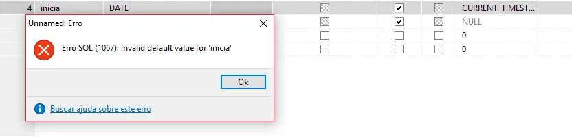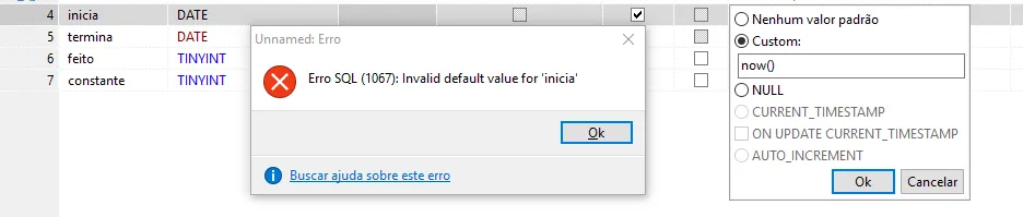 E quando eu tento alterar o valor do campo manualmente para NOW(), eu recebo essa mensagem: