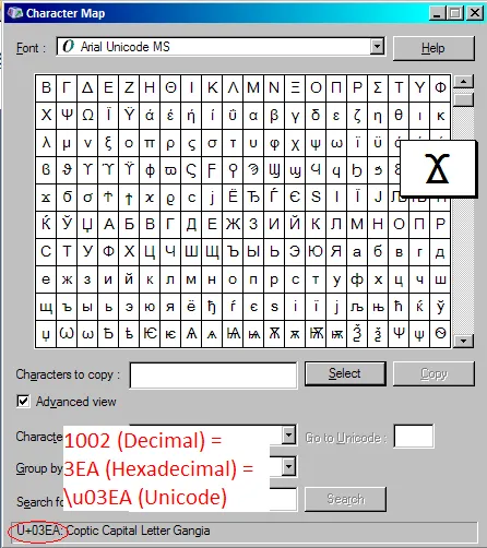Acontece de imprimir um “?” em vez de uma letra “COPTIC CAPITAL LETTER GANGIA” só porque a fonte que foi usada para imprimir não reconhece esse caracter estranho. Por exemplo, no terminal (ou no Command Prompt) normalmente essas letras mais estranhas não aparecem.